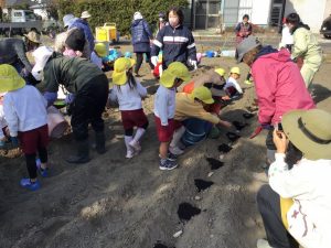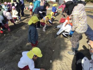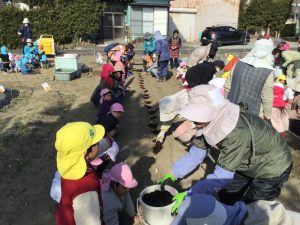3歳児と4歳児のお友だちでジャガイモの種芋を植えました。