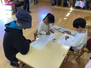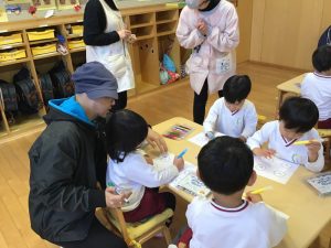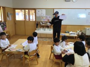 今日は、4歳児クラスに絵本作家のむらまつけーじさんをお招きしてワークショップを開きました。